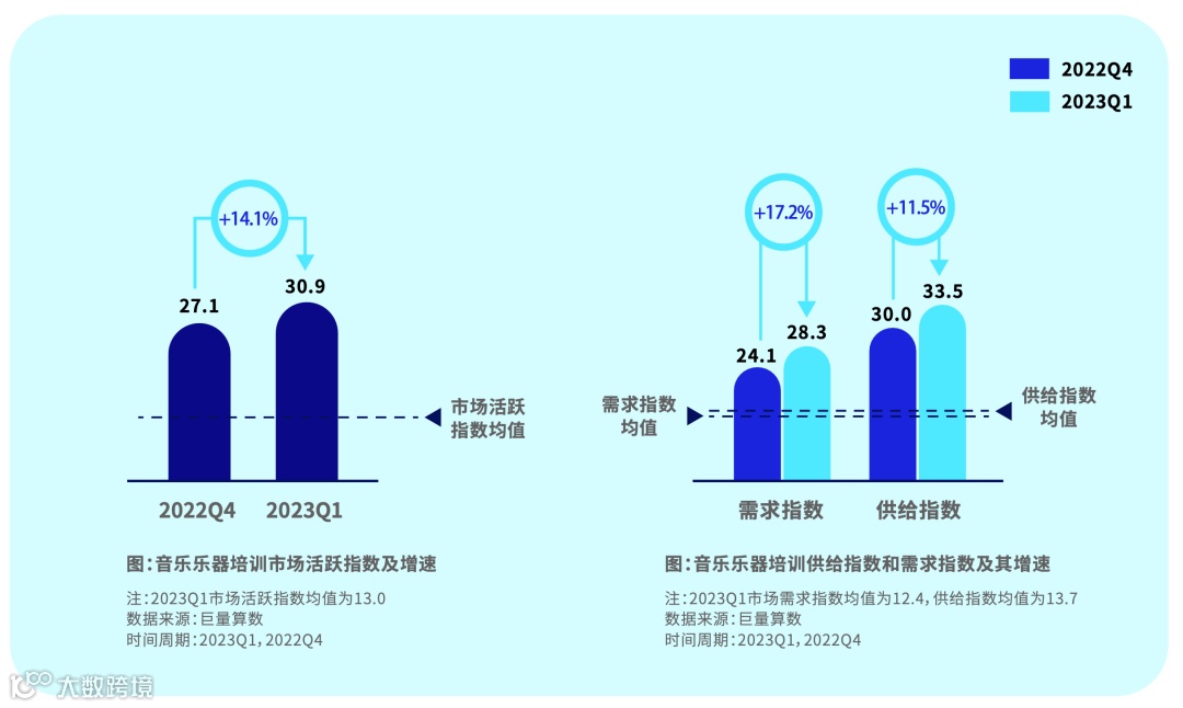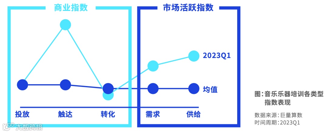 音乐乐器培训市场活跃指数远高于均值,且保持一定的增速,主要由用户内容需求驱动。需求指数和供给指数远高于均值。