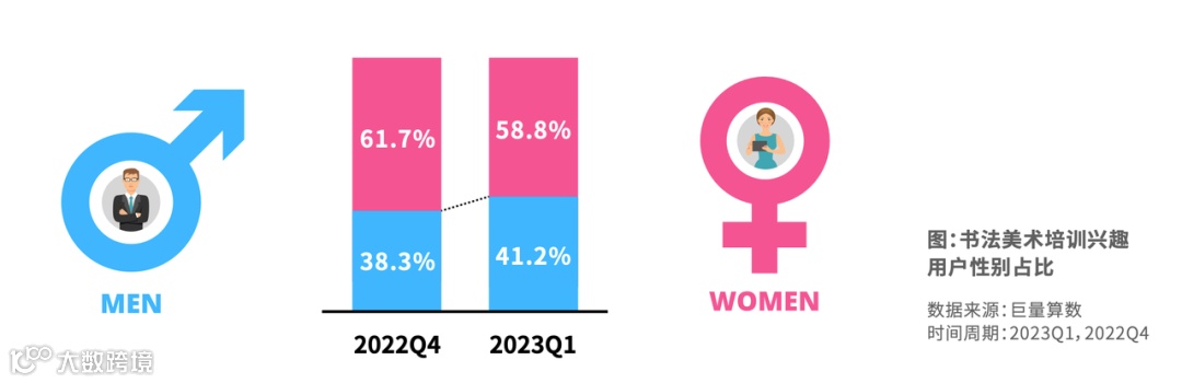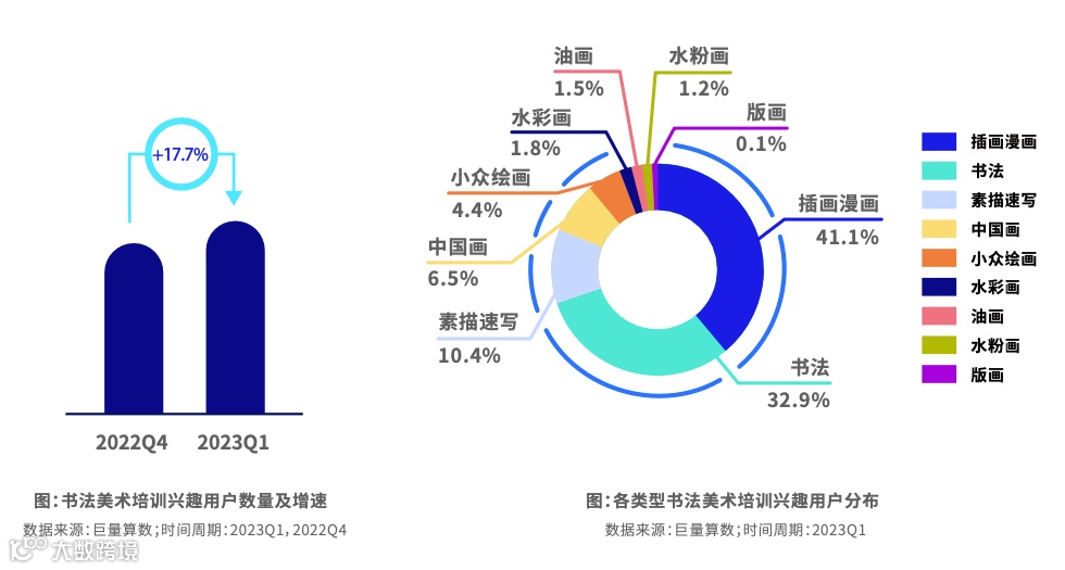 以书法和插画漫画为主的兴趣用户高速增长。兴趣用户超过1千万,增速接近20%。中年群体除了水彩水粉等绘画感兴趣以外对插画漫画也更为青睐。50岁以上的人群更偏好书法和中国画品类。