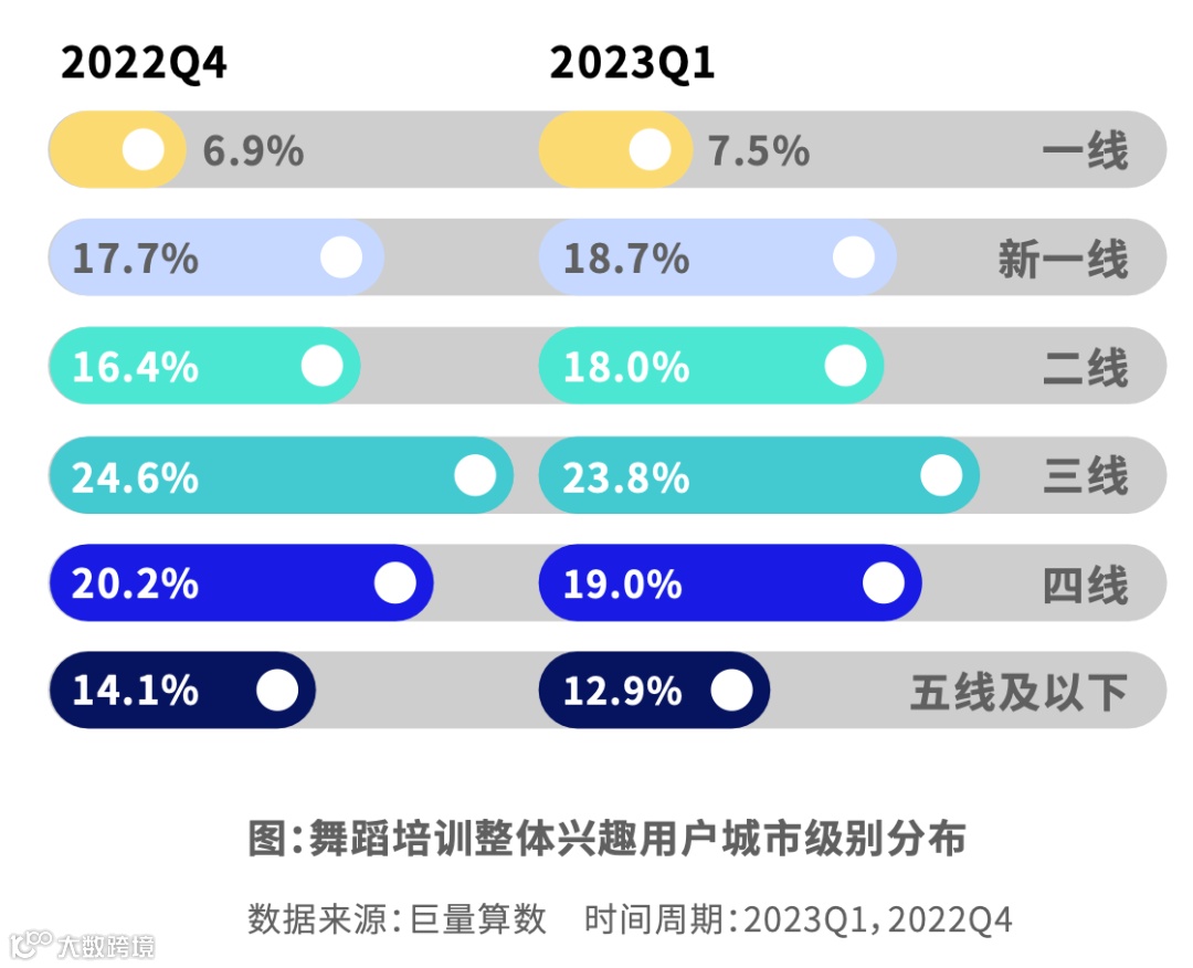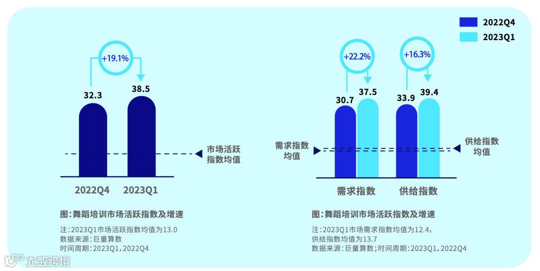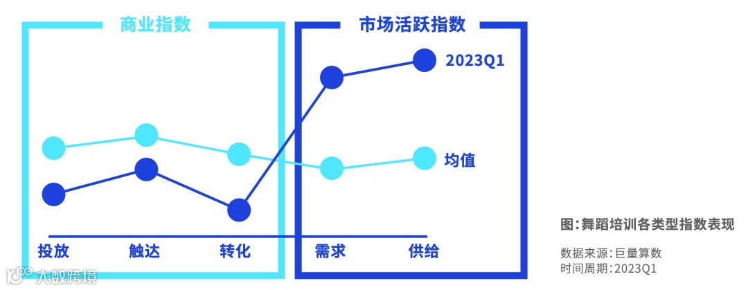 舞蹈培训本季度市场较为活跃,指数远高于均值,增速接近20%,主要由用户的需求驱动。需求指数和供给指数远高于均值。