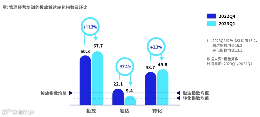 管理经营培训的投放指数较高,增速超过10%。触达用户更加精准,转化指数稳定增长。