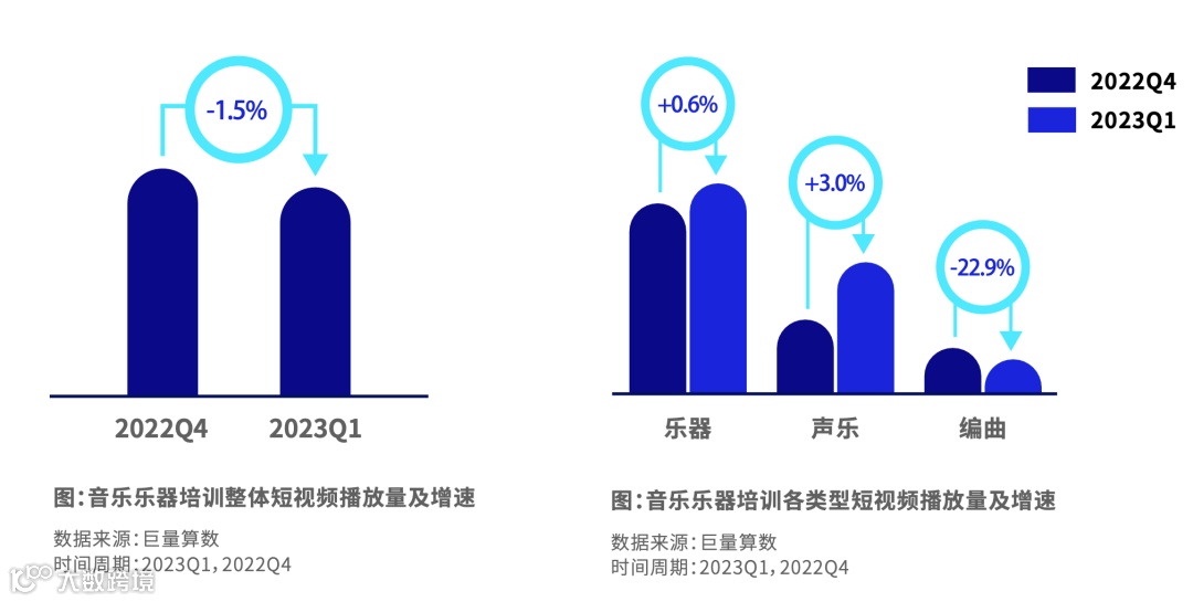 短视频播放量体量庞大,虽略有下滑但播放量占主要的乐器和声乐培训内容保持正增长。用户更偏好在直播深度消费。其中乐器的场均看播时长高于声乐培训。用户主要从入门教学、技巧和特定的歌曲教学等搜索相关内容学习。创作者可以从热门的歌曲舞蹈入手,通过单支歌曲或舞蹈的教学引流。