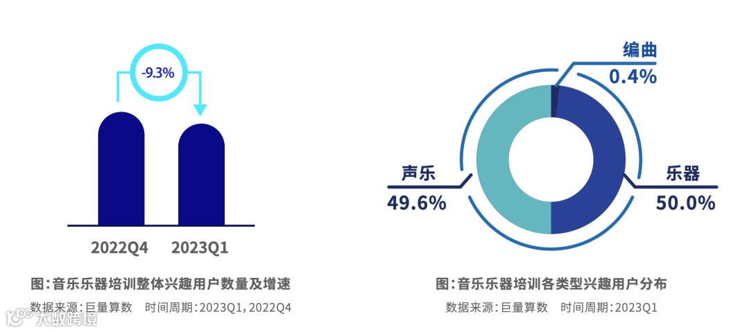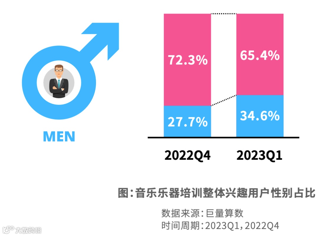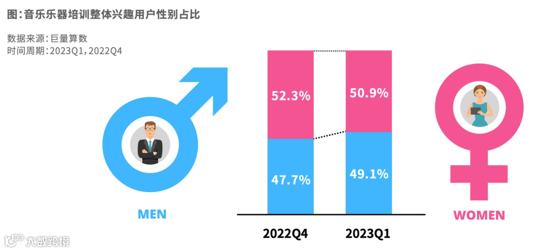 兴趣用户接近4千万,乐器和声乐培训各占一半。男性用户更偏好编曲培训,女性用户则更偏好声乐培训。18-23岁的年轻人喜欢编曲,50岁以上的用户更偏好声乐培训。