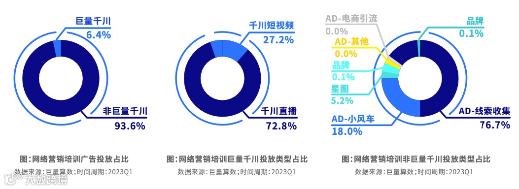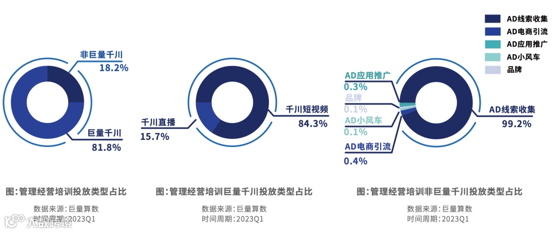 广告投放主要是非巨量千川的投放为主,占比超过90%。非巨量千川线索收集类广告投放占比超过75%。