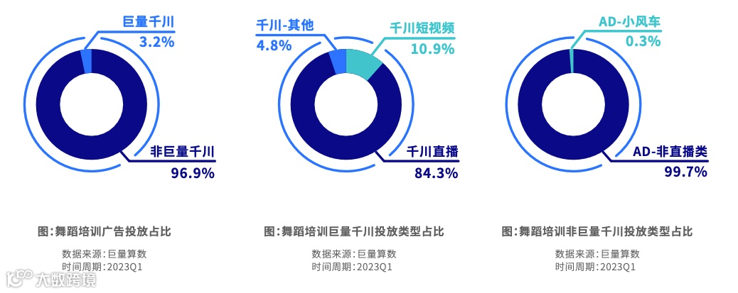 广告投放主要是站外引流为主,占比超过95%。其中站外引流下的非直播类的广告投放较多。巨量千川的广告投放也以直播为主,投放占比超过80%。