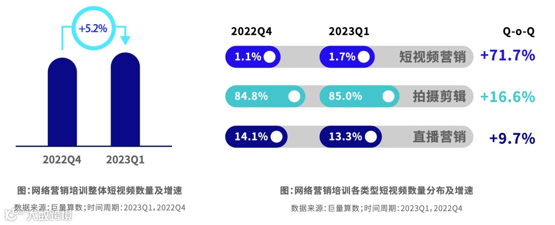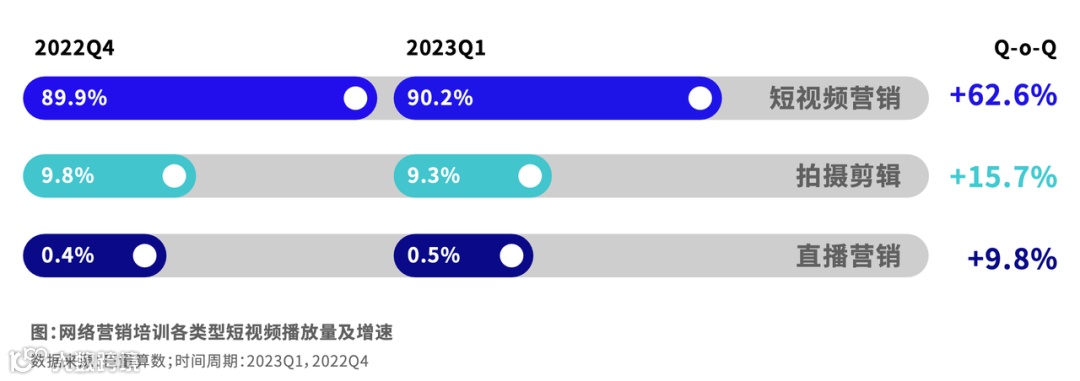 短视频数量增速超过5%,拍摄剪辑类占比超过85%。细分领域中短视频营销培训的内容占比最少但增长最快,增速超过70%。和短视频相比,直播营销培训的直播占比更高,接近三分之一。