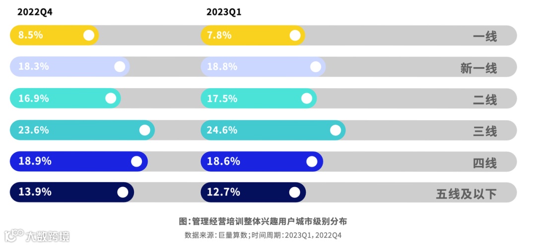 兴趣用户数量增速较高,超过25%。主要集中在市场营销、人力资源和企业文化培训。年轻群体偏好产品策略培训,银发群体偏好商业战略。高线级城市用户更加偏好产品策略和项目管理,低线级城市对于人力资源培训更加感兴趣。