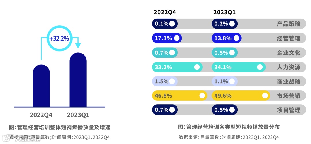 短视频播放量增速较高达到32.2%,主要播放量集中在市场营销和人力资源相关的内容。用户的消费量级、消费深度深度快速提升,互动性进一步增加。用户主要搜索市场营销、人力资源和经营管理相关内容。其中经营管理相关内容的搜索次数增速超过80%。
