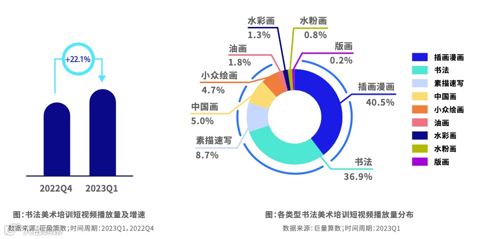 视频播放量高速增长,增速超过20%。播放量主要集中在插画漫画和书法类别。用户更加喜爱传统文化,他们通过短视频学习书法,在直播学习中国画。用户主要搜索书法入门教学和特定的某一种字体或者某一个字的写法。除此之外,家长也更加注重孩子书法美术等素质教育培养。