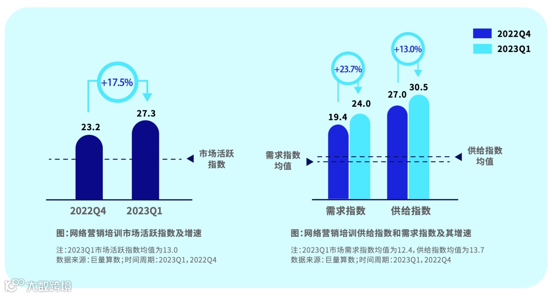 网络营销培训内容市场较为活跃,整体指数上涨17.5%。内容供给和需求指数远高于均值,需求带动整体市场活跃指数增长。供给指数高于需求指数,未来可聚焦在用户更加感兴趣的细分品类上。