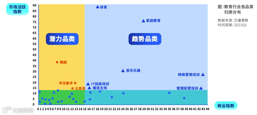 本季度将趋势品类的重点聚焦到网络营销技能、管理经营培训和音乐乐器。这三个品类市场活跃指数和商业指数较高,是“终身学习”和“兴趣培训”的代表品类。潜力品类将聚焦在舞蹈和书法美术。这两个品类代表着“兴趣培养”,市场活跃增速较高,但商业还有巨大的发展潜力。