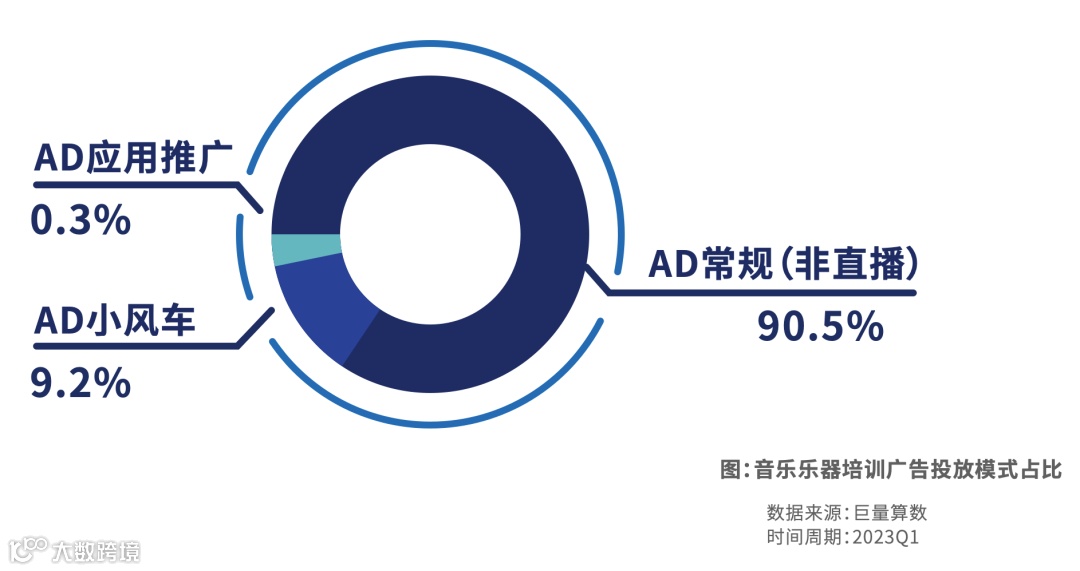 音乐乐器培训广告投放主要以AD广告为主,其中常规非直播类占比超过90%。