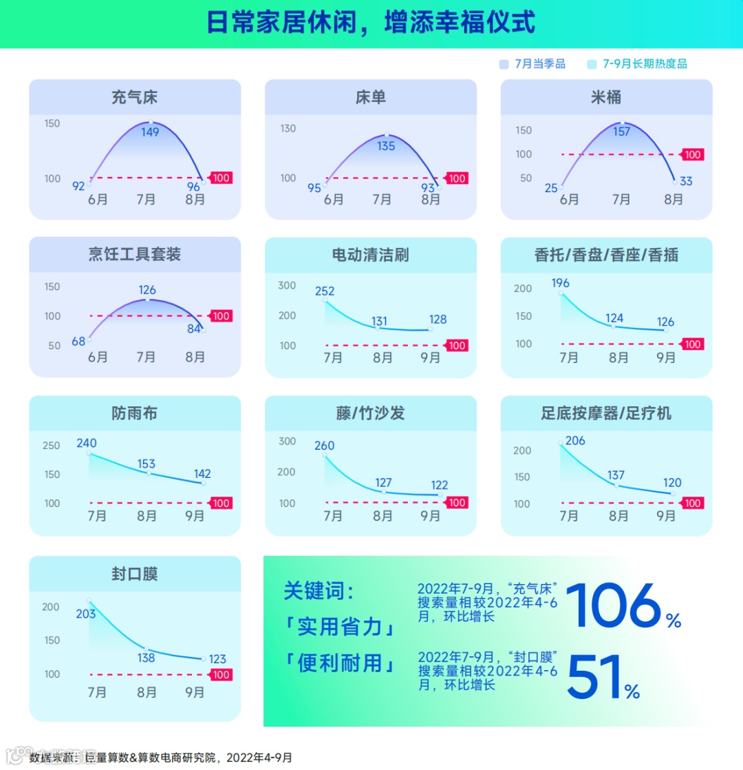 巨量算数&算数电商研究院洞察到,7 月季节品的货品卖点聚焦于夏日生活方面,既关注舒适悦己的日常生活,也有节日赠送礼物的仪式感。将商品放在使用场景里,可以更好地展示使用产品带来的影响和变化,打造美好生活愿景。