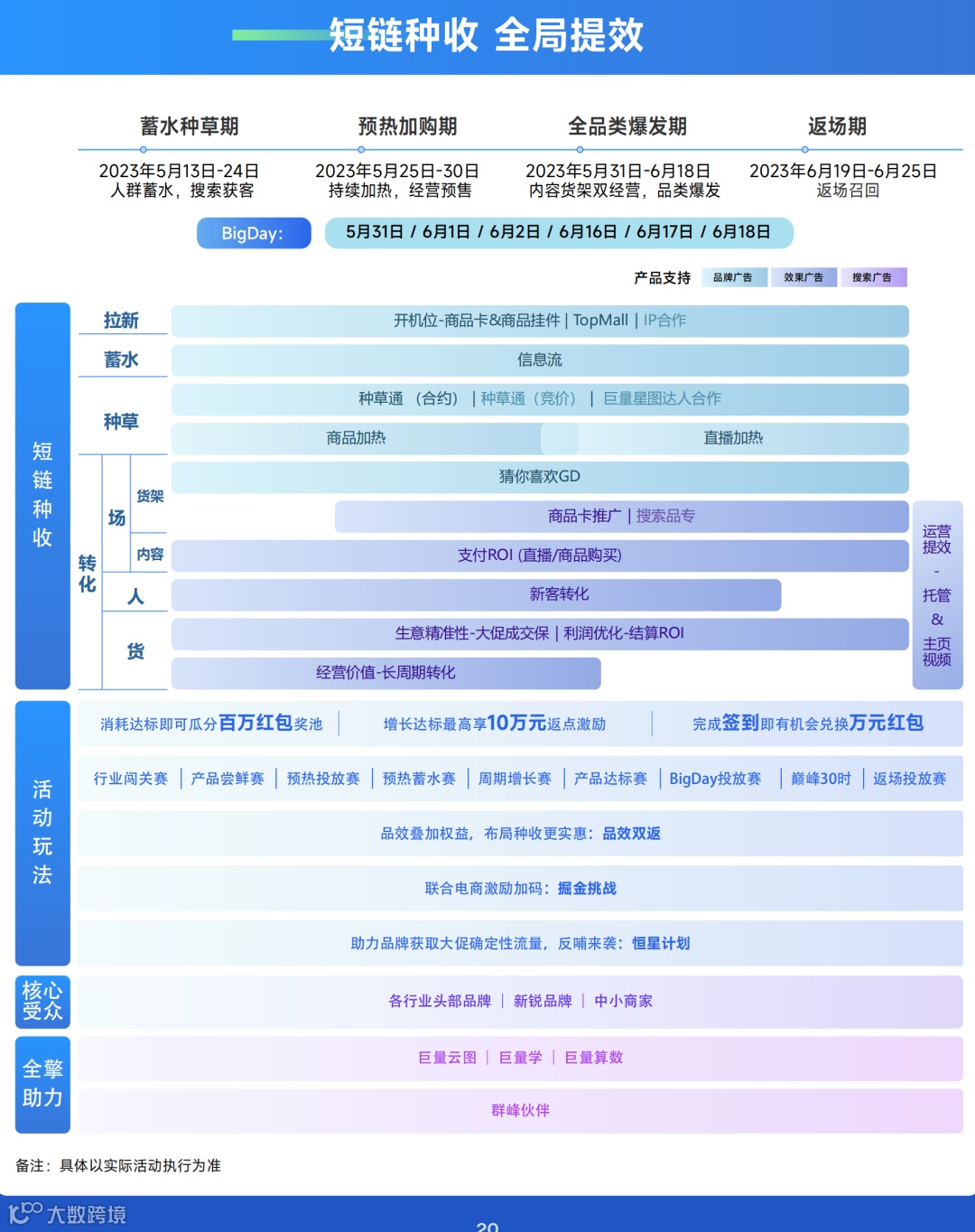 前置做好运营筹划,配合预热期营销动作,参与福利会场玩法。进一步的,通过精细化运营提效,助力大促生意爆发,最后配合返场期追投目标,完成营销投放复盘。