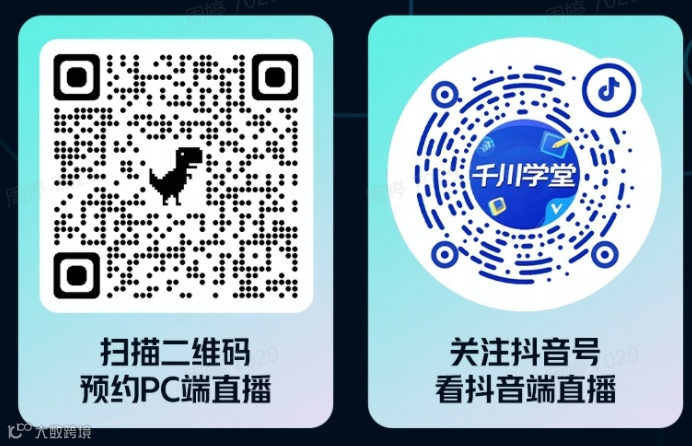 【大咖驾到】是巨量千川汇专为服务商设计的一系列专栏,主要目的是为了提升服务商的整体运营水准。本次课程将在抖音号“千川学堂”和PC端“巨量学-千川学堂”双端直播,扫描以下二维码可分别预约PC端和抖音端直播。