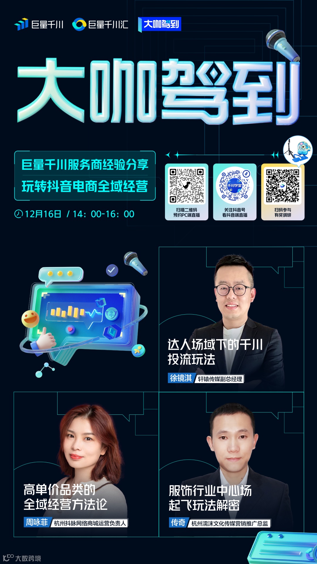 12月16日下午14:00-16:00,三位巨量千川汇导师——轩辕传媒副总经理徐镜淇、杭州抖脉网络商城运营负责人周咏菲、杭州濡沫文化传媒营销推广总监传奇,将在【大咖驾到】第十期直播间《玩转抖音电商全域经营》与大家见面。