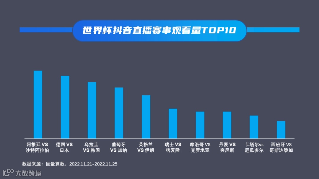 通过抖音体育的直播数据来看,小组赛C组第1轮阿根廷和沙特阿拉伯的比赛最受用户的关注。