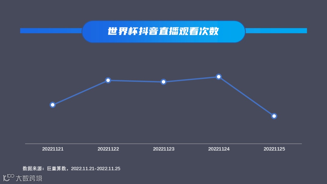 数据统计,自世界杯开赛以来,通过抖音体育账号观看世界杯直播的用户持续攀升,看播量也随之上扬。11月21日开幕赛受到用户关注,看播量高开高走。25日举行的第一轮最后两场比赛——葡萄牙 VS 加纳和巴西 VS 塞尔维亚,两场比赛分别在凌晨0点和凌晨3点的“冷门时间”开赛,整体看播次数略有下降(本周只统计第一轮的赛事)。