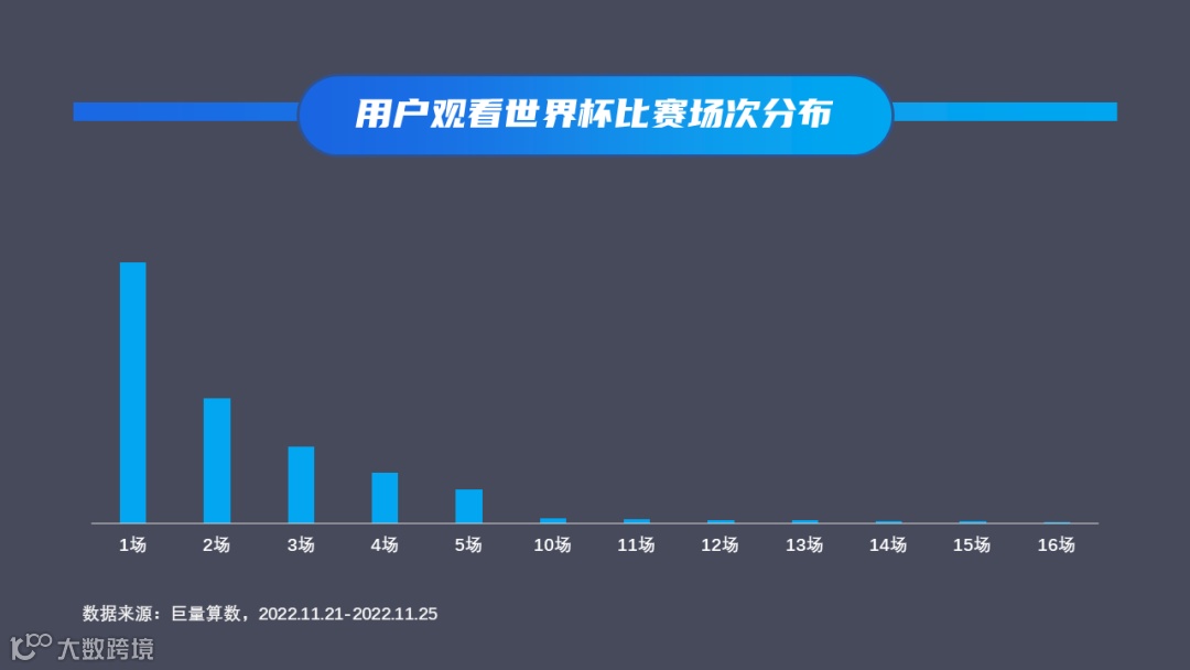 据统计,本届世界杯第一轮赛事从下午北京时间18点到凌晨3点,每隔3个小时就会有一场比赛。由于大部分用户的个人时间安排和赛事时间会有一定冲突,所以很难实现所有关注的比赛都观看。巨量算数数据显示,在第一轮16场比赛中,观看过1-3场比赛的用户达到76%,观看4-9场比赛的用户占比22%,观看过10场及以上比赛的用户占比超过2%,对于这类“铁杆球迷”而言,熬夜是常事,场场不落才是对世界杯最大的尊重。