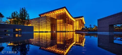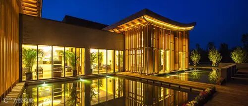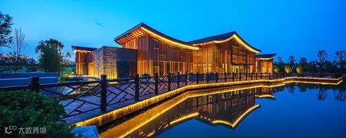 建筑整体灯光强调建筑群屋顶灯光的层次和错落,以及近人尺度灯光的舒适性和亲近感,做到“由内而外”,以暖色光为主要基调。远远望去,柔和、有退晕的光表达了建筑的细节和层次感。“人字形”木望板灯光一字排开,做为建筑灯光的特征和第一层次;侧面微微翘起的檐椽空间,用线性灯洗亮,表达飞檐出挑的节奏感,并与正面灯光形成呼应,为建筑灯光的第二层次;立面装饰木格栅和内透光,形成剪影效果,使立面富于变化,形成建筑的第三个层次;植物和景墙做为景观照明的重要元素,以低功率的灯具照亮,做为最后的层次出现。