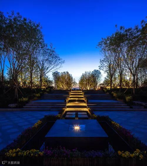水墨写意,基本的水墨画只有水与墨,黑与白;唐宋人画山水,多湿笔,出现“水晕墨章”之效。此处的建筑灯光借用中国山水画的浓、淡形成的“墨韵”手法,形成光的层次变化和对比,描绘出一幅富有禅意的光影画面。夕阳西下,自南向北隔水望向售楼处,建筑轻盈的漂在水面上,山水如画。