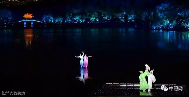 图注:这是以灯光渲染的树木植被亭台为背景的大型城市实景演出,灯光将故事情节烘托的淋漓尽致。(图片来自网络)