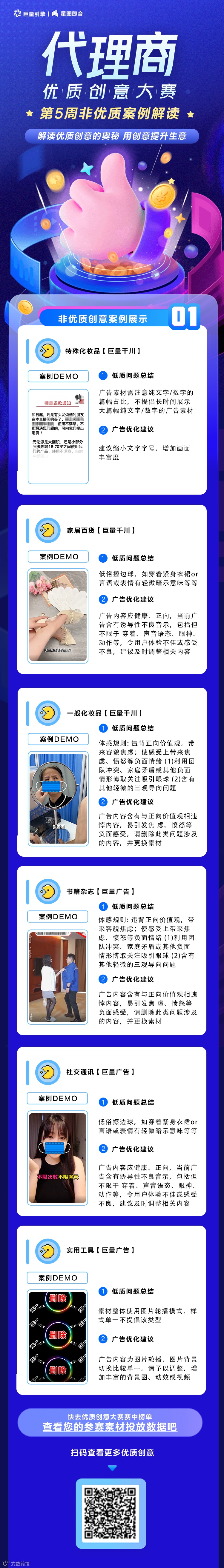 本周重点解读特殊化妆品、家居百货、一般化妆品、书籍杂志、社交通讯、实用工具六个行业出现的高频低质素材,通过对非优质内容的拆解分析,让同类问题得到改善,解读创意的奥秘,用创意提升生意。