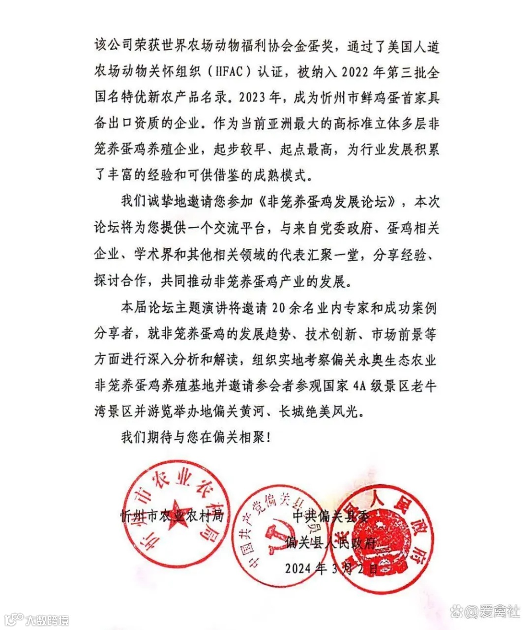 在山西省偏关县县委、县政府的支持下,我们首次举办《非笼养蛋鸡发展论坛》,有助于促进非笼养蛋鸡养殖行业的交流与合作,推动非笼养蛋鸡养殖模式的发展,以满足消费者对于高品质、可持续、动物友善的蛋类产品的需求。