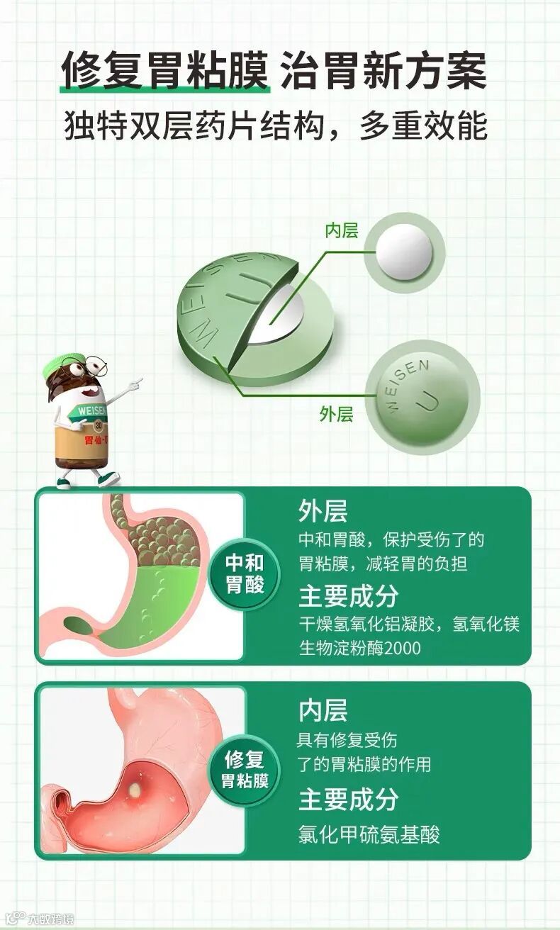 胃仙U已在全球畅销60余年,具有独特的双层药片结构、多重效能,可以有效中和胃酸、促进消化、修复胃黏膜。