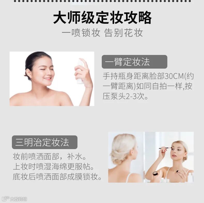 常规使用:妆前保湿,妆后定妆,保持妆容清透服帖;
