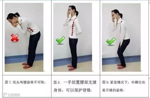 打喷嚏时最好采取坐姿,这样可以减小胸腹腔的压力变化。如果站着打喷嚏时,最好把一只手放在腰部支撑身体,或者有意识地收缩颈部和腰部肌肉,以对抗冲击力,保护脊椎。紧急情况下,立即采取半蹲位也是不错的姿势,就像下面这样~