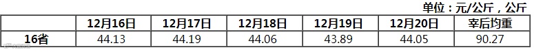 据农业农村部监测,上周(2019年12月16日-12月20日),16省(直辖市)白条猪肉出厂价格周平均值为每公斤44.06元,比此前一周微跌0.2%,但比上年同期还是涨了145.9%。