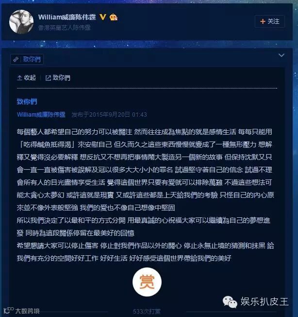 在传了无数次分手之后,陈伟霆和蔡卓妍(阿Sa)9月20日凌晨发布长篇微博证实两人和平分手的消息。