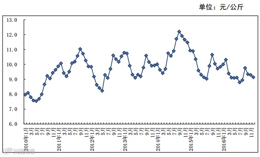 最近7年鸡蛋行情曲线图(来源于农业部畜牧司)
