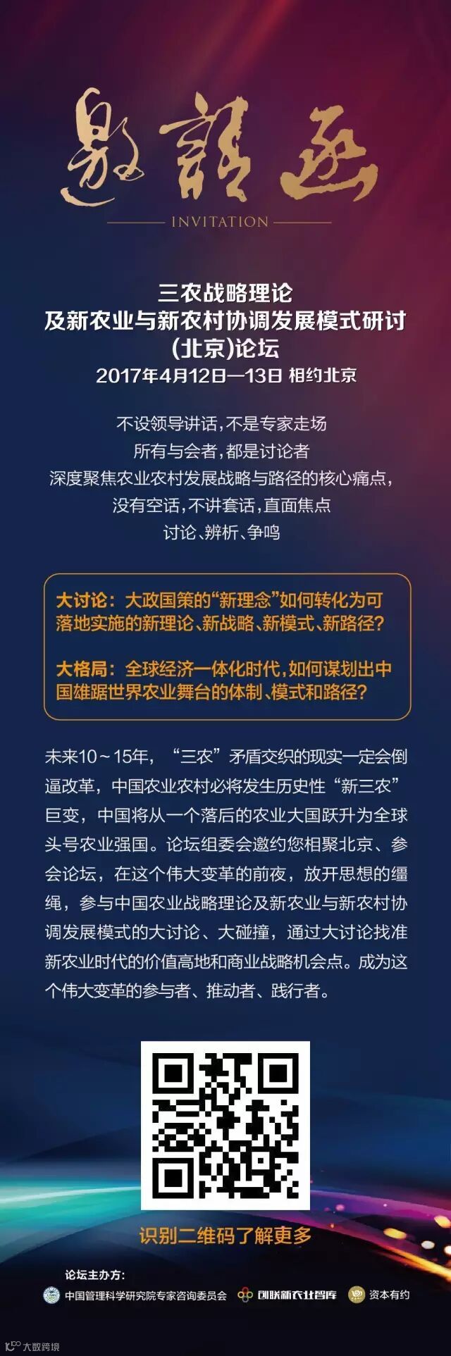 这个论坛是一个极具大格局思维和前瞻性“新三农”战略与路径大讨论的思想盛宴,对所有关注、研究、探索农业农村发展改革重大突破性创新的不同阶层参会者,第一时间参与研讨和倾听新农业与新农村协调发展伟大变革的方向、目标、策略和途径,对中国农业现代化未来发展战略趋向及商业机会把握,必将产生深刻的价值影响。