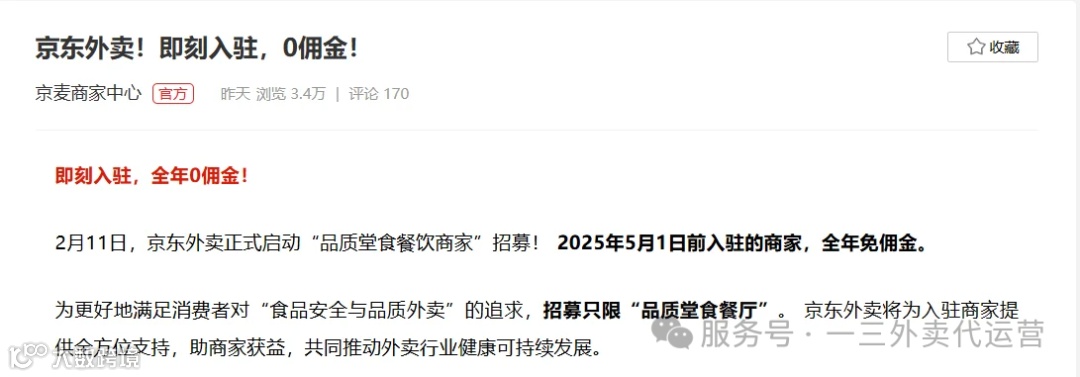 京东:2025年5月1日前入驻的商家全年免佣金,仅收取配送服务费,这大大降低了商家成本。不过,京东外卖目前商家数量相对较少,在平台上的竞争相对较小,但曝光量也可能不如美团,需要商家自己想办法提高店铺知名度。