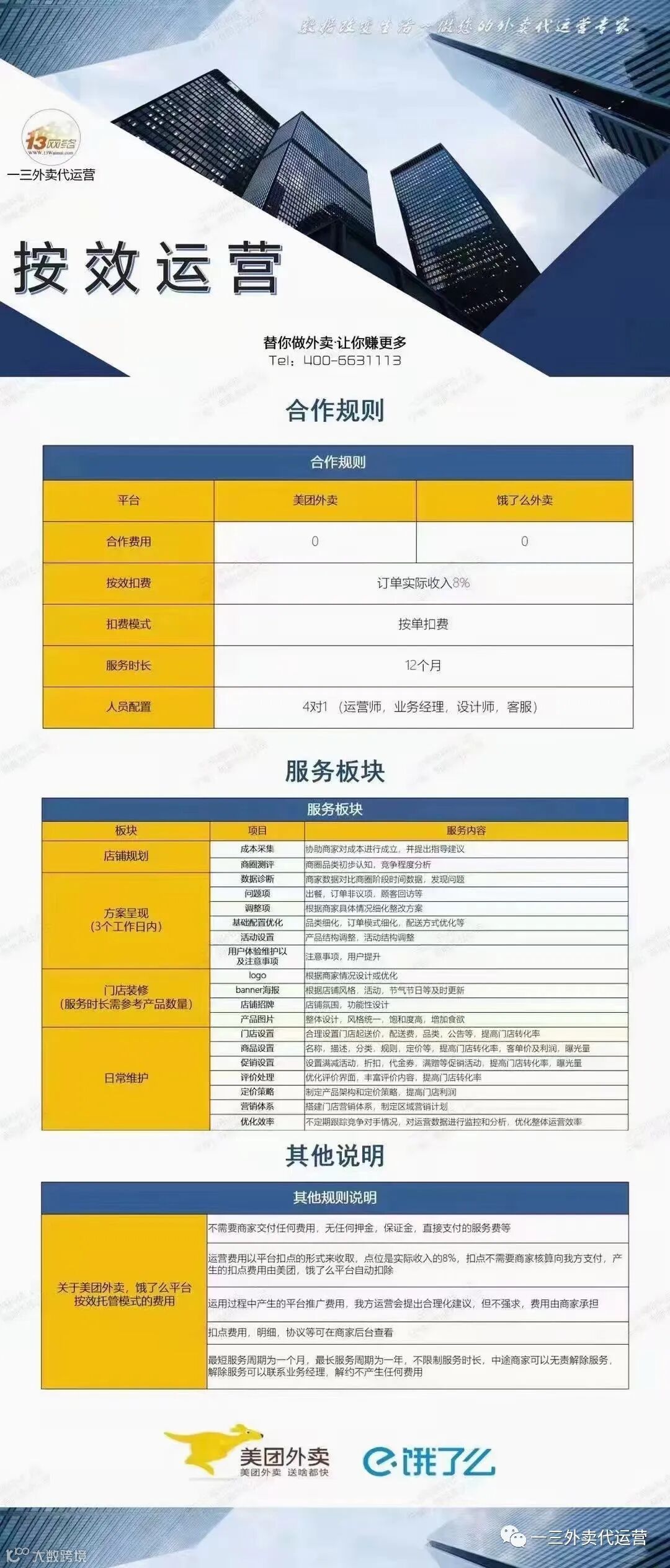 总结一下, 其实还有很多小坑也是致命的,做餐饮外卖很多事情本身都是细节的工作,一着不慎全盘皆输。所以为了提高做外卖的成功率,我们要把一些细节工作做好。避免盲目借鉴别人成功的经验导致最终的失败。如果您不知道该怎么避坑、没有时间操作觉得繁琐、不知道该如何经营好自己的店铺,可以找我们。一三外卖代运营,替你做外卖,让你赚更多!