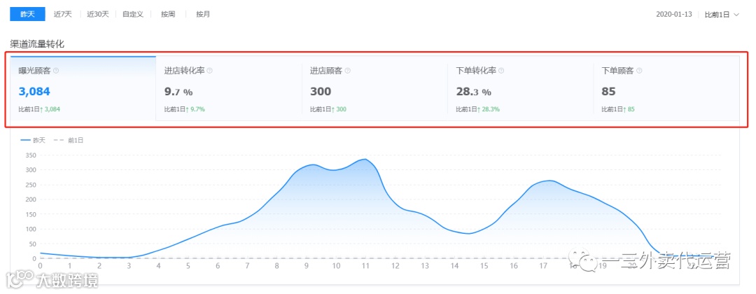 接下来就是流量板块,众所周知的一量三率就在这里体现,而且还会分时体现你在何时的数据高,在何时你的数据低。这里引入小时入店率和小时转化率的概念,可以在分时折线图观察你的哪个时间段入店率高、转化率高,从而找到店铺规律,在推广注重投资回报率,从而控制支出,减少无味的花费。