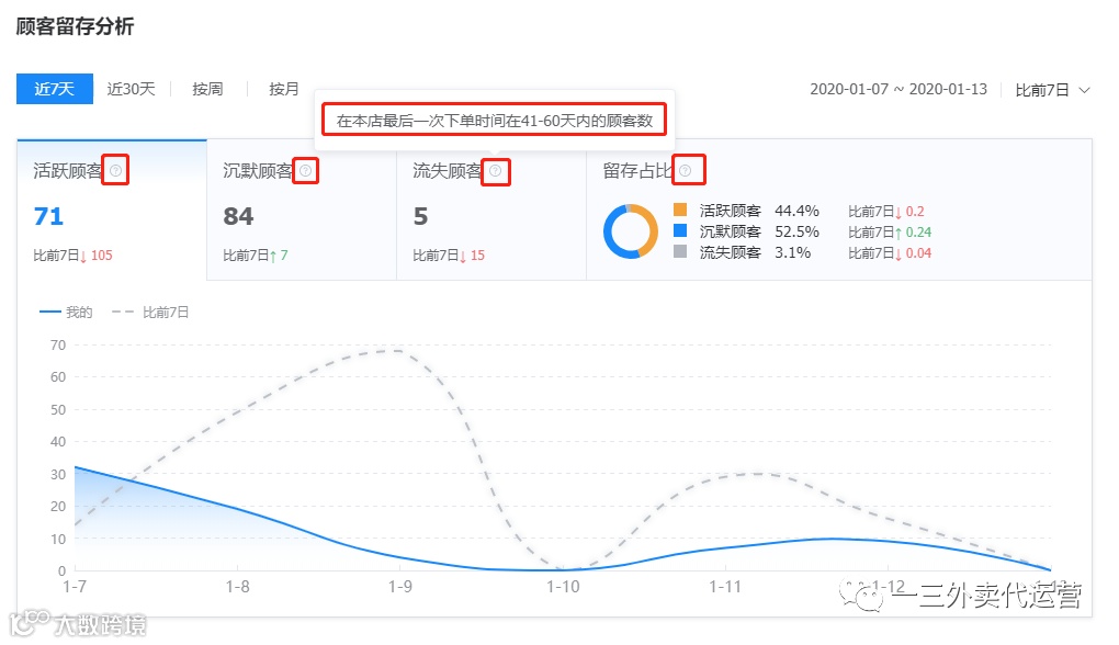 紧接着,还是在顾客分析板块,我们可以看到顾客留存分析表,明确的告知了店铺顾客的活跃顾客、沉默顾客和流失顾客的占比情况。什么是活跃顾客,饿了么定义的标准是最后一次下单在0-20天之内的是活跃顾客,每20天一个档位,这里也给大家一个参考标准,就是你的活跃顾客占比在33%左右,你的沉默顾客和流失顾客占比在67%左右。