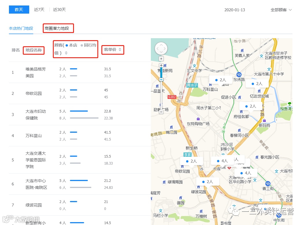 还是在顾客分析看板,我们可以看到一个热门下单地段的分析,我们可以看到在本店下单最人们地段有哪些,而同行均值又是多少;还能看到商圈潜力地段都有哪些,在这些地段有多少人点本店,同行均值又是多少。你可能会发现商圈最热门的地段,在你的店铺下单的人比较少,而同行均值有很多,说明在这些地段你的店铺不吸引人,那么为什么,教大家一个简单的方法,就是用使用饿了么外卖app,定位在商圈热门地段,你观察你的店铺和同行店铺的区别,是排名低还是活动力度小,亦或是价格高,从而针对性的调整你的店铺配置。
