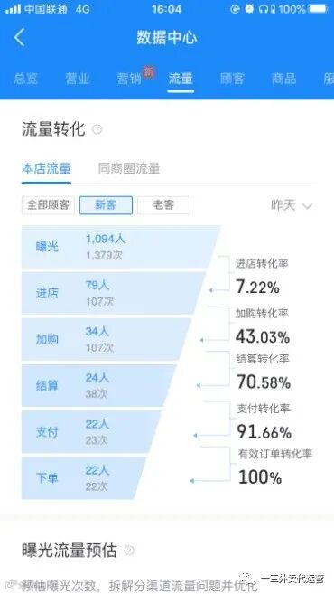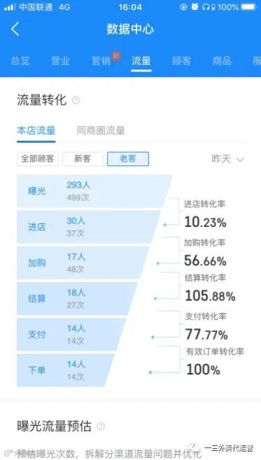 我们发现在流量这个版块,我们给出很多参考值及公式,其目的也是为了让大家能够真正了解到平台的规则,从而知道如何才能获得更多平台加权,得到更多的平台流量。而接下来要改大家引入一个重点部分,就是你的下单顾客有多少是老客复购有多少是新客下单,你的新客转化率和老客转化率需要达到一个什么样的标准才算是健康店铺。在新一期的饿了么后台更新中,已经把这部分转化率呈现给大家了,不需要再通过公式去计算。