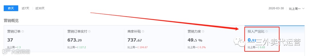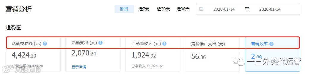 在新一期的饿了么更新后,数据中心添加了营销板块,这里有活动力度及投入产出比的参考,从这里可以看到我们的力度和商圈同行的差距,从而为了要单量的上升,可以在活动力度上做调整,从而达到在商圈有竞争力。
