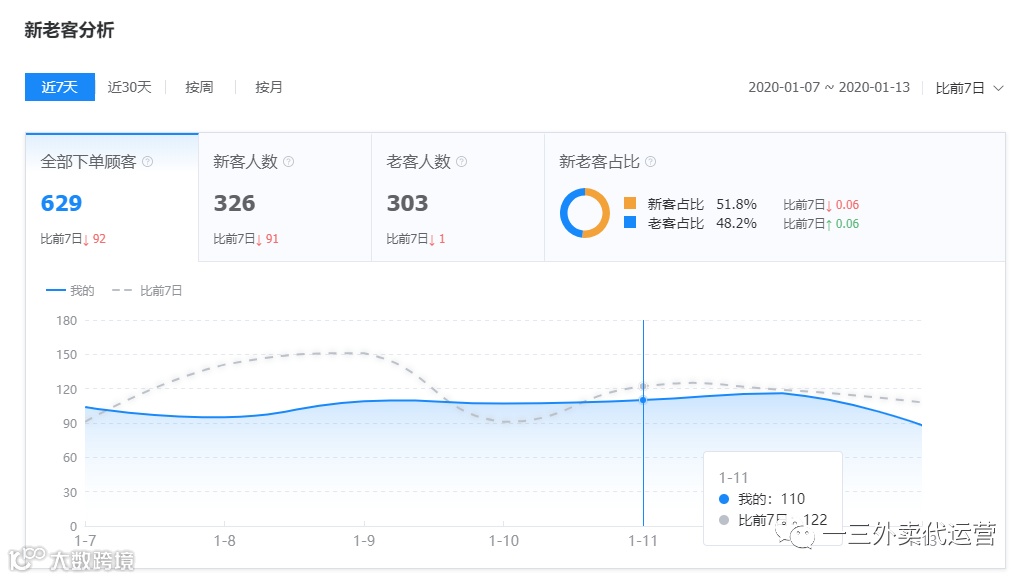 那如果你的老客占比高于标准,说明你的店铺只有回头客,没有新客进来,长此以往你会发现你的单量会越来越少,因为你的老客可能会有各种原因离开你的商圈,而你又没有新客进来变成你的老客。所以你需要做些拉新,增加新客活动,做竞价推广提高曝光量让新客进来。