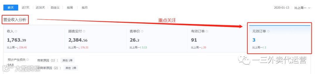 第二个板块就是营业看板,可以看到各个时期的订单收入情况,这里重点强调一个部分,就是无效订单。什么是无效订单,无效订单简单说就是顾客下单了,而后各种各样原因没有完成形成了退单。无效订单分为两种,商家原因和非商家原因,我们要避免商家原因的无效订单,减少非商家原因的无效订单,因为你的无效订单越多,说明的店铺质量越差,平台会降低你的权重比,从而下降你的自然排名。