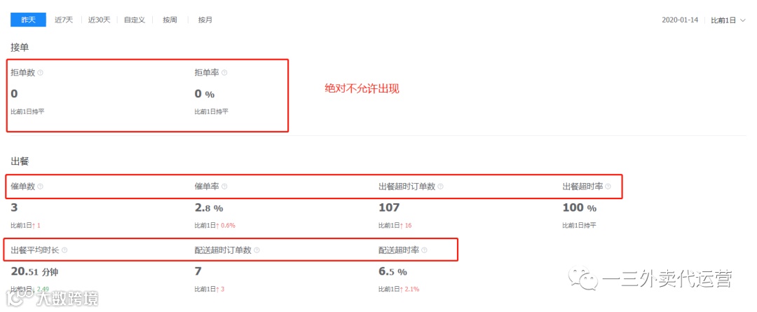 最后一个板块就是服务板块,需要注意几点,这几点都是平台降权项,需要避免。1.拒单:绝对允许出现;2.催单:按时完成,沟通骑手,自配送的情况下做好时间管控,避免催单率过高;3.出餐:出餐完成及时点击出餐完成;4.配送超时率:1%是标准,超过10%平台会给与降权,撤销资源等处罚。