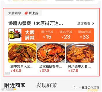 关于钻石展位模块,一般建立品牌形象的商家使用较多。顾客看到感兴趣的海报(banner)就会点击查看。此模块时一个很烧钱的推广方式,曝光了极大。但是有效流量少之又少。曝光量大:每位顾客打开美团外卖时,都会看到这个模块,那这个流量就产生了。有效流量少:虽然每位顾客都能看到这个模块,但能够吸引顾客的活动、产品、就没那么乐观了。