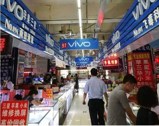 营销:在几乎一到四线城市的手机销售聚集区,OV阵营的蓝绿组合几乎占据了80%的户外广告资源和店面展示资源,对于一般消费者而言,深入其中会让你感觉智能手机就是OV的天下,OV联合线下曾经被边缘化的大小商户以及线上被边缘化的传统纸媒等渠道建立了“统一战线”,发动 “人民战争”。从这个视角看,华为、苹果、三星等多个品牌的专营店,既像大海中的孤岛,又像守卫品牌的“碉堡”。总之,一到四线城市销售聚集区的营销势能OV完胜;如图1天津卖场。