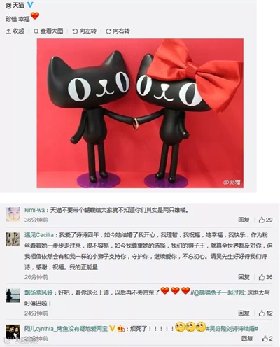 热门事件的曝光平台基本上基于微博微信两者之间,其中也包括事件的预热阶段,如周杰伦结婚,从信息爆出到婚礼结束,均在微博话题榜单首页。但微博平台的短效热议度决定了一个事件从发生到结束时间一般为1-2天,甚至短到可以按小时来计算。所以,在热门事件或是话题人物出来后,品牌首先需要捷足先登的发出带有品牌形象的关联文案,让粉丝第一时间知晓后转发并互动,既有娱乐敏感性又能产生流量。以吴奇隆刘诗诗领证为例,代表作:天猫,杜蕾斯等。