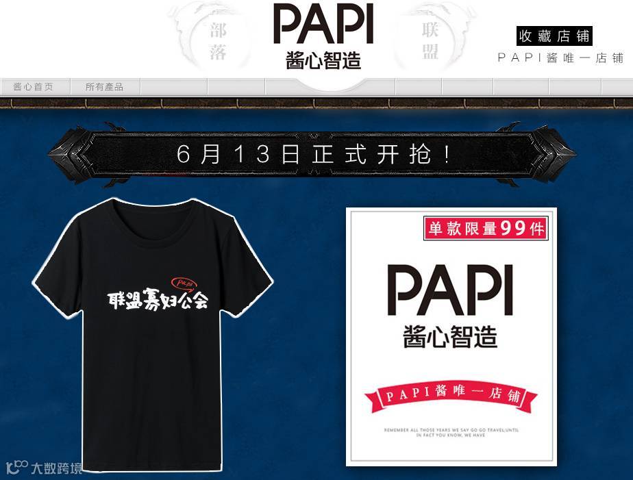 13日下午6点多,papi酱发布魔兽影评短视频,papi酱身着胸口印着“部落寡妇联盟”字样的T恤出现,并在视频下方放出了店铺宝贝销售地址,其余并未为淘宝店“papi酱心智造”多做宣传。