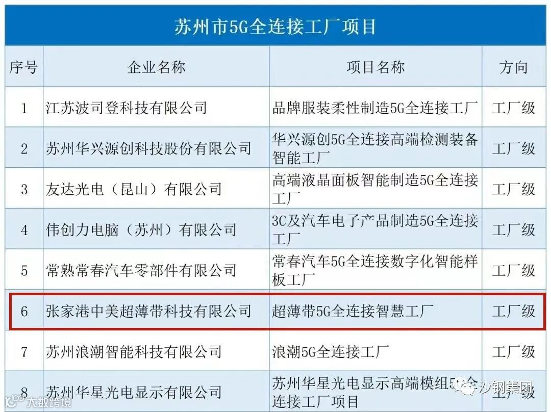 近日,苏州市工信局公示2023年度苏州市5G全连接工厂项目名单,江苏沙钢集团有限公司独资子公司——张家港中美超薄带科技有限公司荣誉上榜。