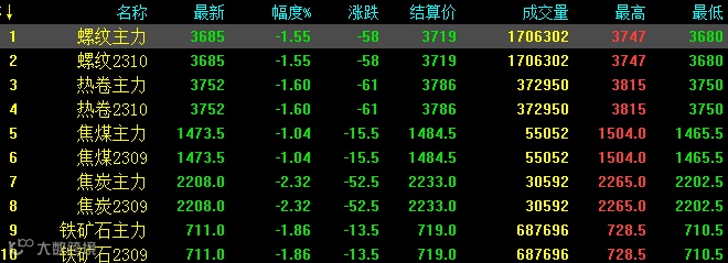 25日螺纹钢主力合约失守3700元/吨关口,创半年内新低。螺纹钢主力跌58,收报3685,跌幅1.55%;热卷主力跌61,收报3752;焦煤主力跌15.5,收报1473.5,跌幅1.04%;焦炭主力跌52.5,收报2208,跌幅2.32%;铁矿石跌13.5,收报711,跌幅1.86%。